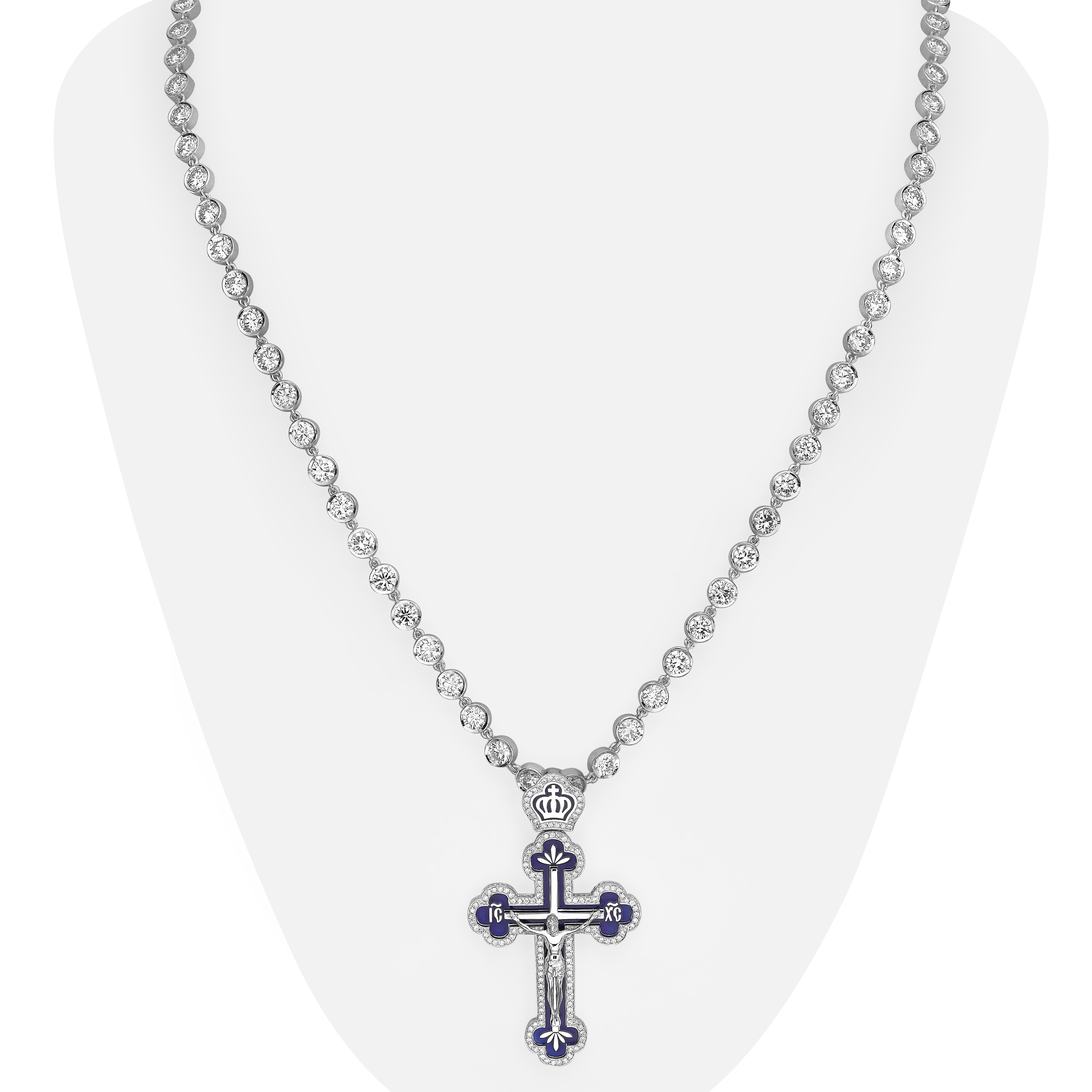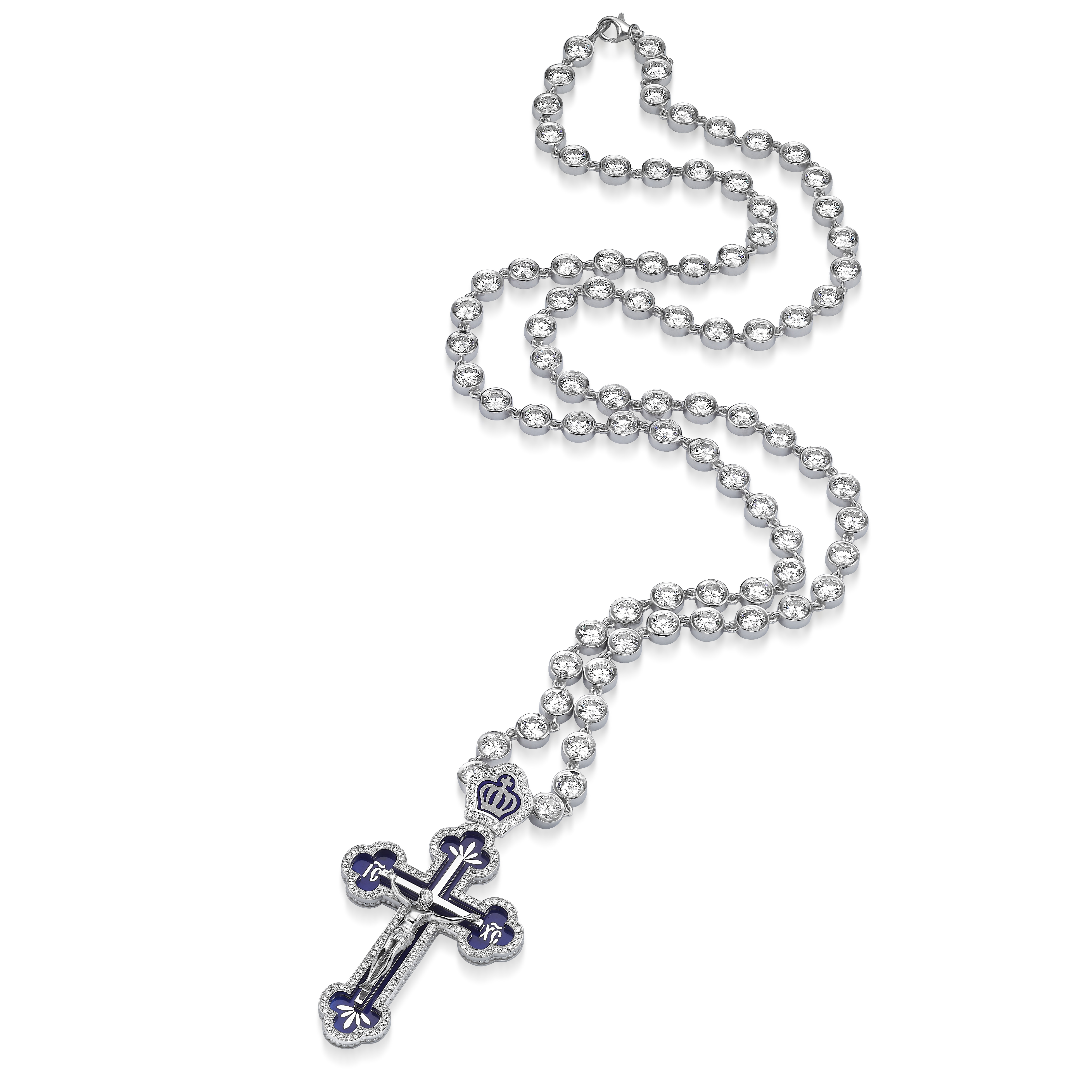 BLUE ENAMEL CROSS PENDANT SET WITH 162 ROUND BRILLIANT LG DIAMONDS, A TOTAL OF 0.81 CARAT, D-E-F COLOR, VS1-VS2 CLARITY ACCOMPANIED BY A CHAIN OF 84 ROUND BRILLIANT LG DIAMONDS, A TOTAL OF 22.44 CARAT, D-E-F COLOR, VS1-VS2 CLARITY. IN 18 KARAT WHITE GOLD.