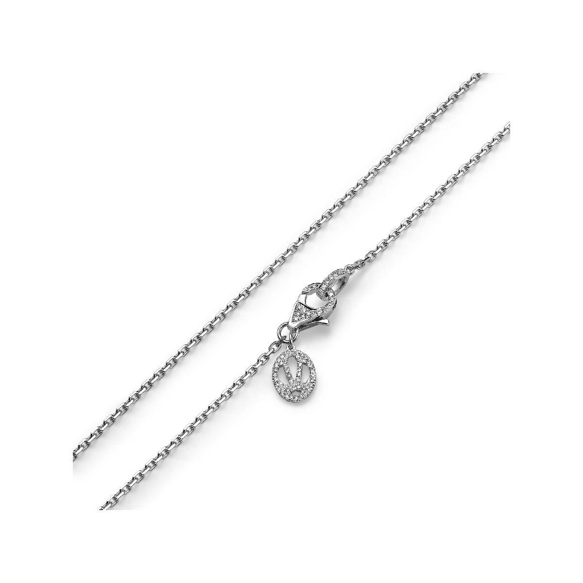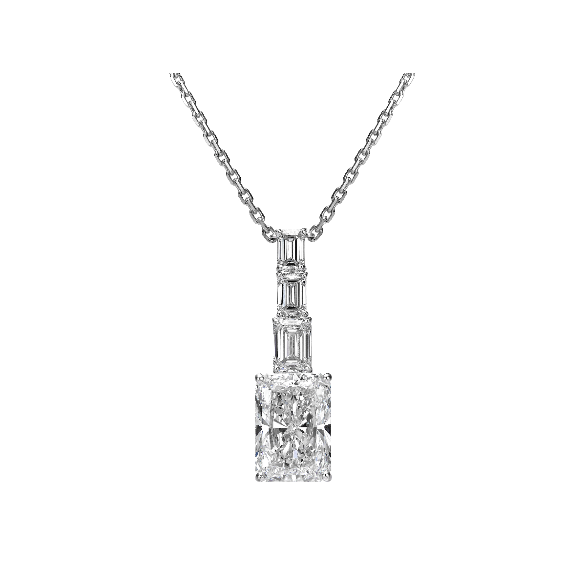 Gracing the Champs-Elysees collection, this architectural 18K white gold masterpiece suspends a spectacular 7.53 carat radiant lab grown diamond. A cascading line of emerald and round lab grown diamonds elegantly elevates the brilliant drop, totaling 9.91 carats.