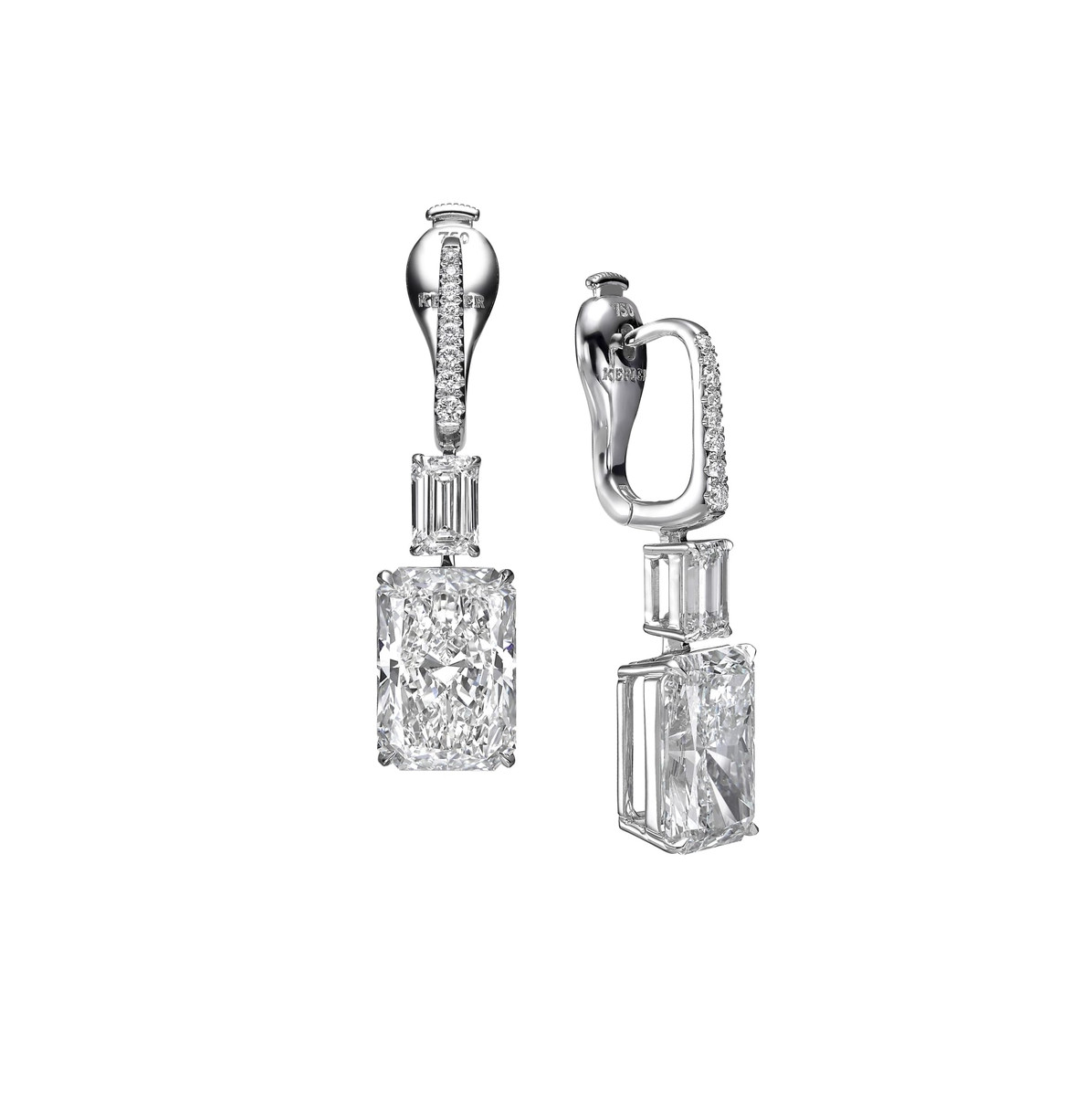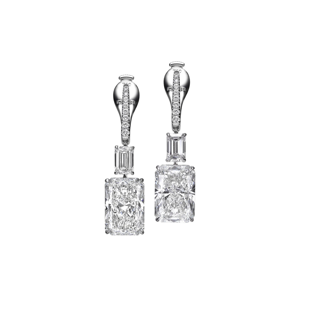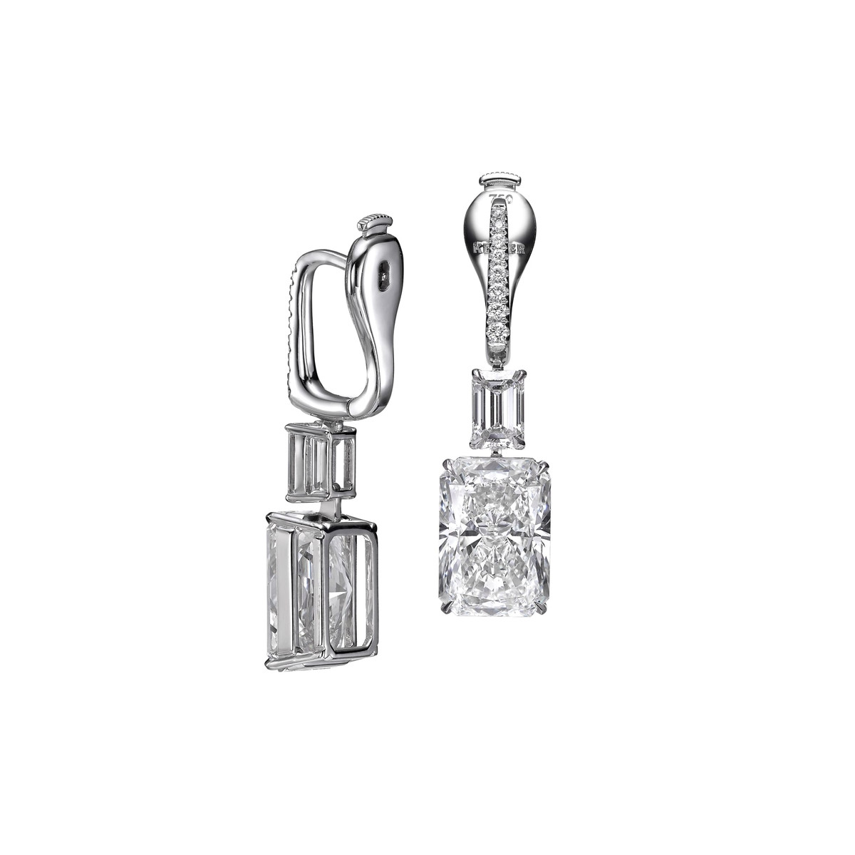 Illuminating the Champs-Elysees collection, this 18K white gold masterwork suspends two breathtaking 5.03 carat rectangular lab grown diamonds. A brilliant geometric cascade of accent stones elegantly elevates each magnificent drop in a true triumph of high jewelry artistry.