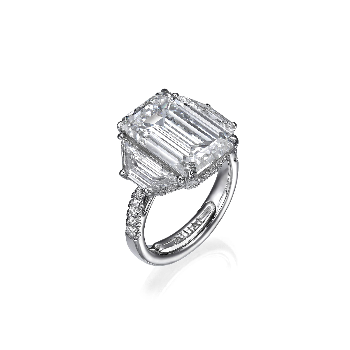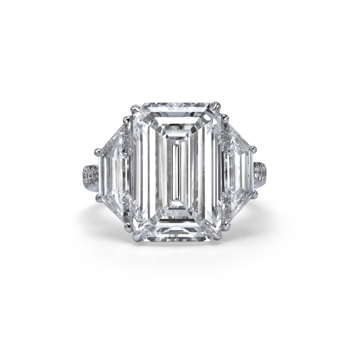 Gracing the Champs-Elysees collection, this 18K white gold masterpiece centers a breathtaking 8.38 carat emerald cut lab grown diamond. Sleek trapezoid lab grown diamonds elegantly frame the step cut core, culminating in 10.06 carats.