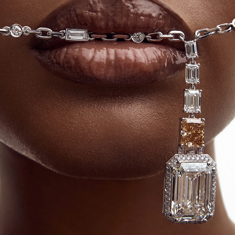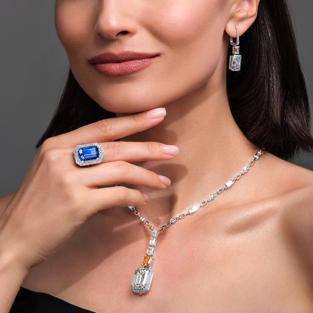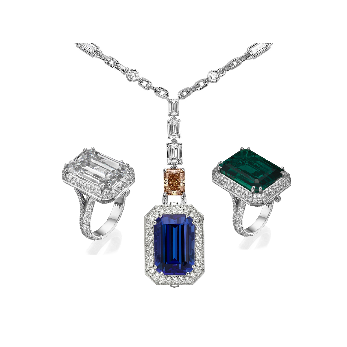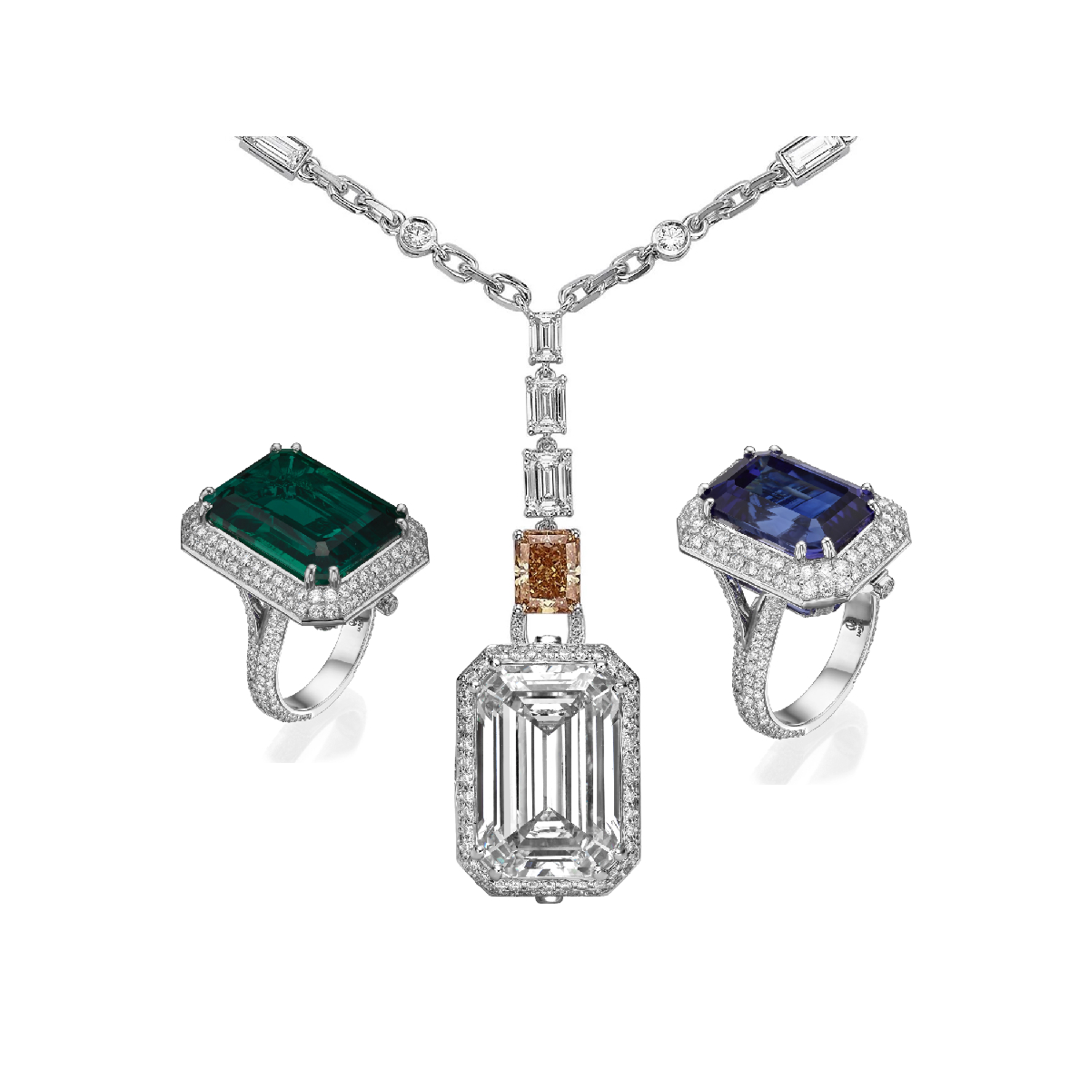 This exceptional piece features 3 interchangeable center stones — Emerald, Diamond, and Tanzanite — each effortlessly attachable to either the necklace or the ring. Two of the three stones may be worn simultaneously, one adorning the necklace and one completing the ring.