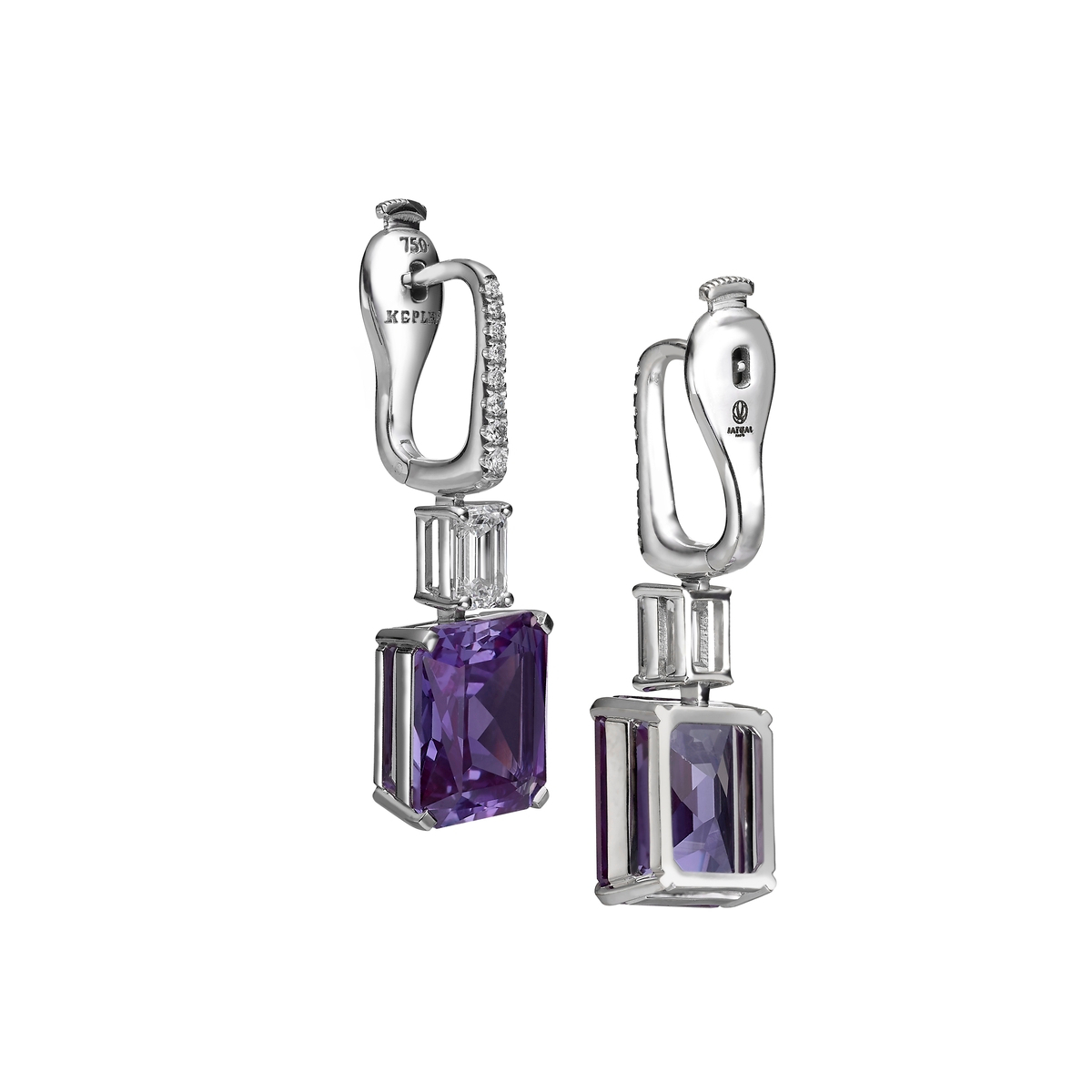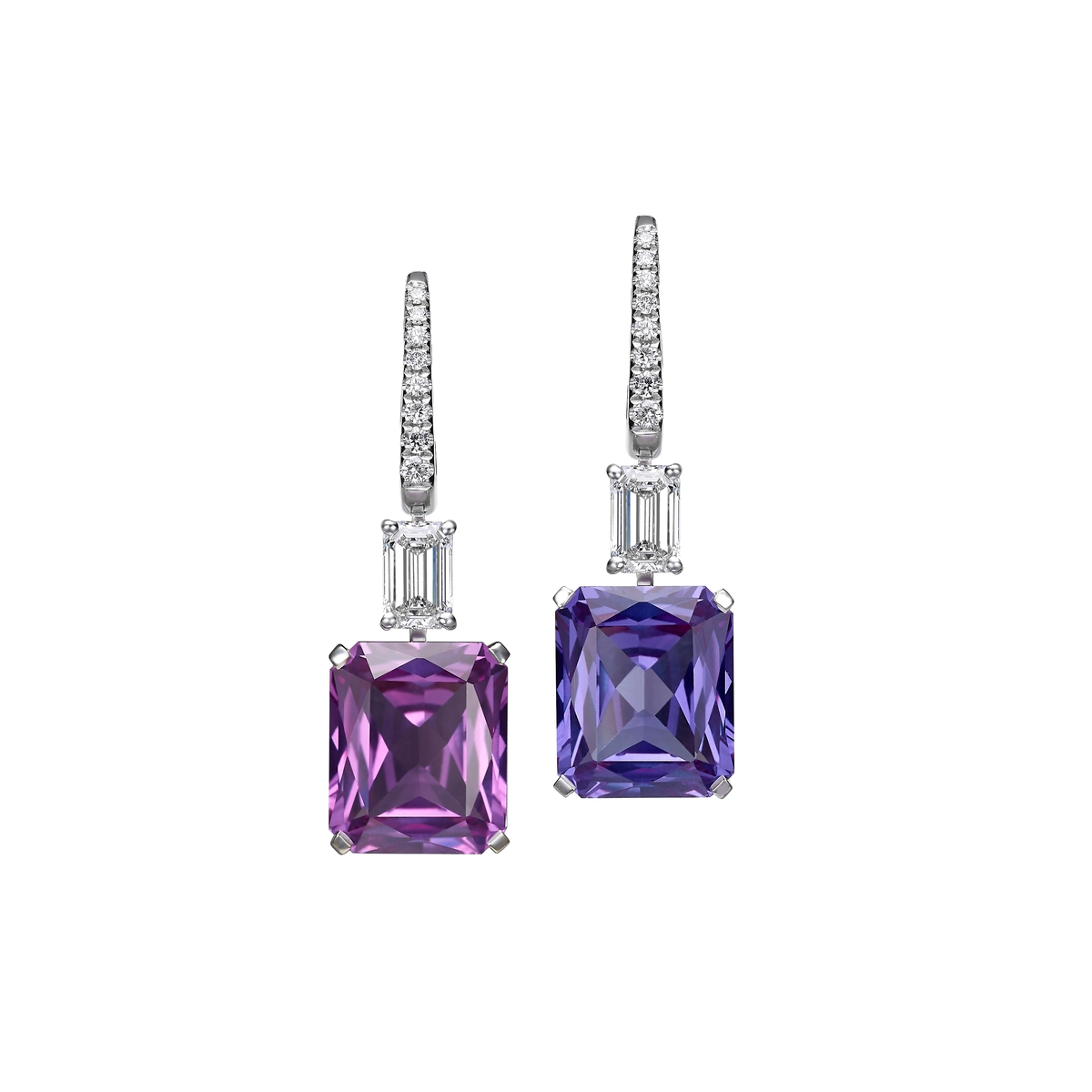 Gracing the Ciel de Paris collection, this 18K white gold masterpiece suspends two mesmerizing color change radiant lab grown sapphires. A luminous line of round and emerald cut lab grown diamonds gracefully crowns the twilight hues, totaling 15.12 carats.
