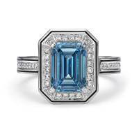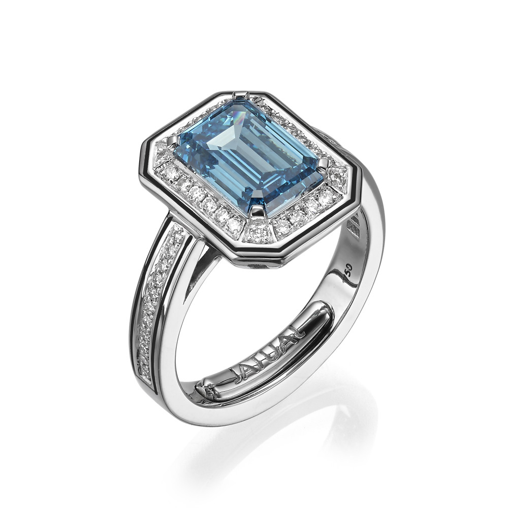 RING SET WITH 3.11 CARAT FANCY VIVID BLUE EMERALD SHAPED LG DIAMOND, VS1 CLARITY ACCENTED BY ENAMEL & 46 LG DIAMONDS, D-E COLOR, VVS CLARITY. IN 18 KARAT WHITE GOLD