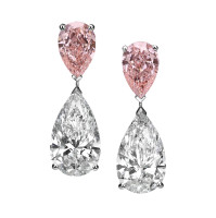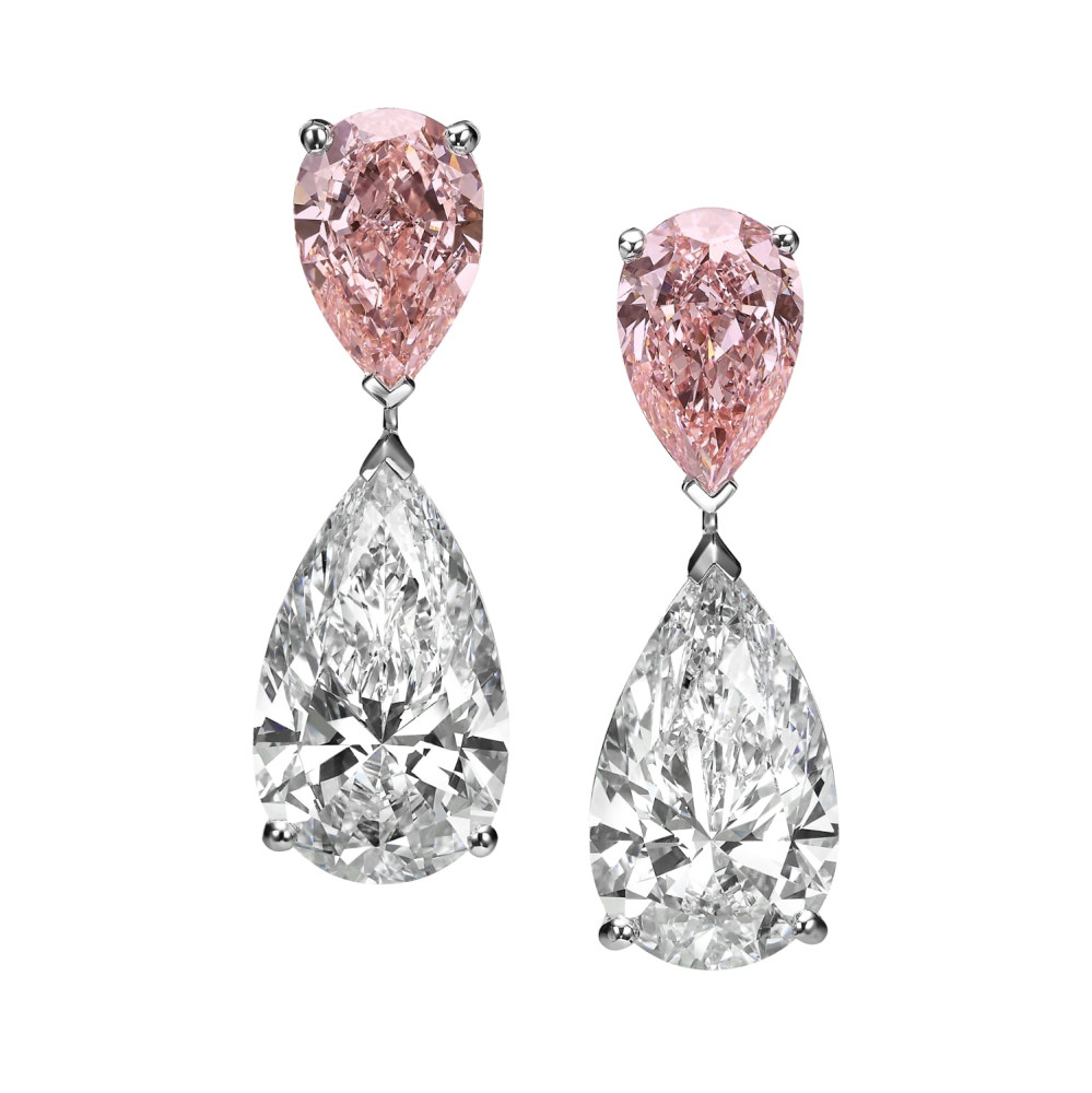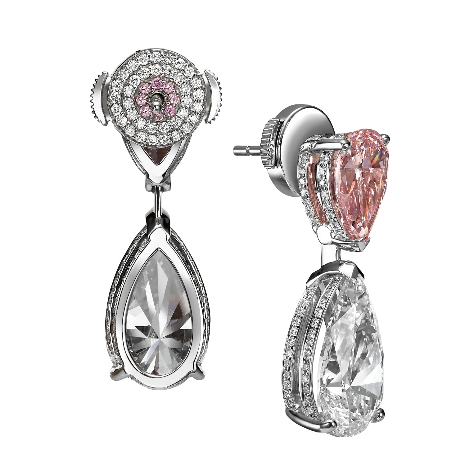 EARRINGS SET WITH PEAR SHAPE DIAMOND DROPS, A TOTAL OF 12.16 CARAT, F COLOR, VS1 CLARITY AND FANCY INTENSE PINK PEAR SHAPE DIAMONDS, A TOTAL OF 1.43 CARAT, VS1 CLARITY, ON STUDS PAVE-SET WITH PINK AND WHITE DIAMONDS. IN 18 KARAT WHITE GOLD.