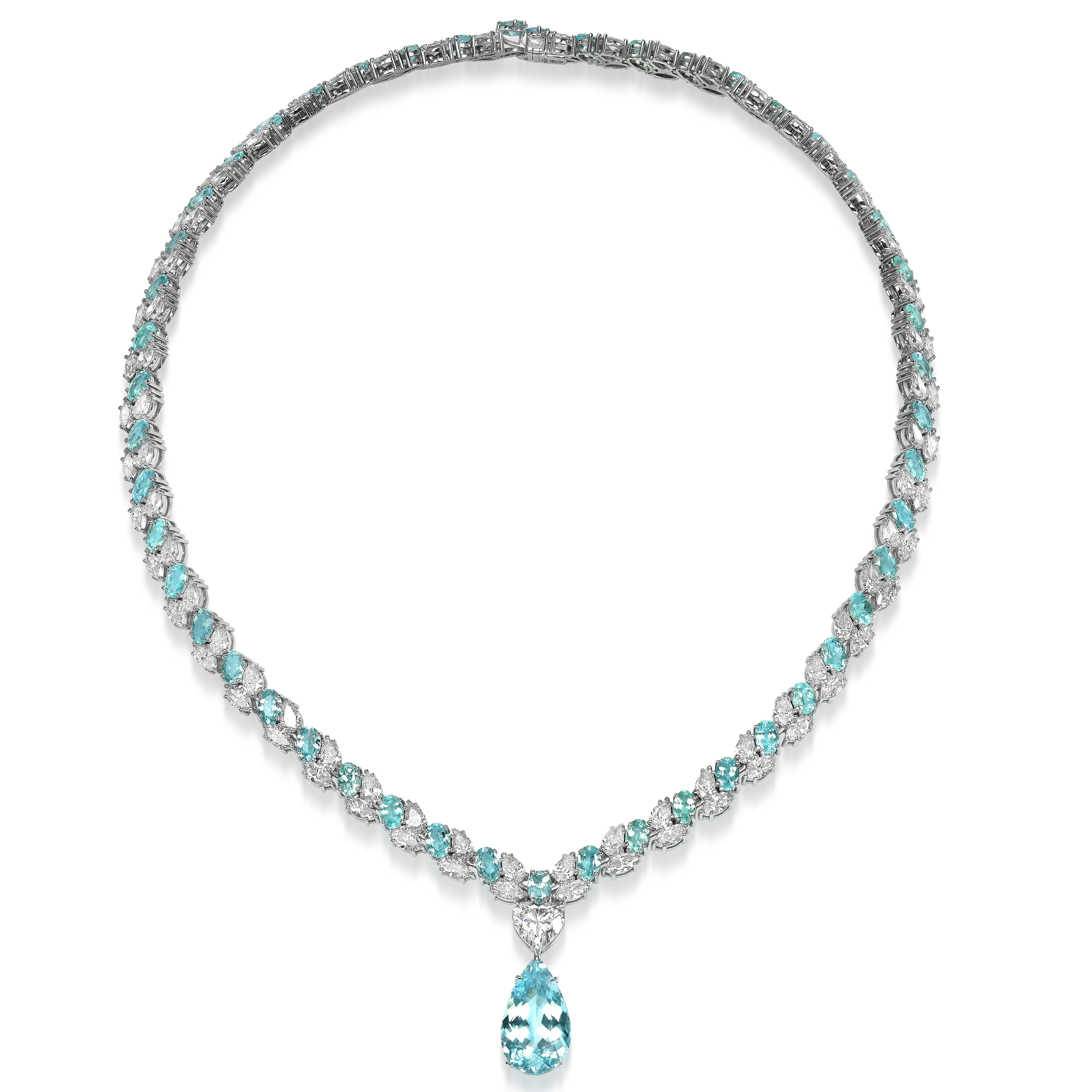 A luminous cascade of 18K white gold cradles a pear of natural Paraiba, a heart of the ocean's softest blue. Surrounded by the pure fire of lab-grown diamonds, this piece whispers secrets of eternal elegance and deep devotion, a treasure worn close to the soul.