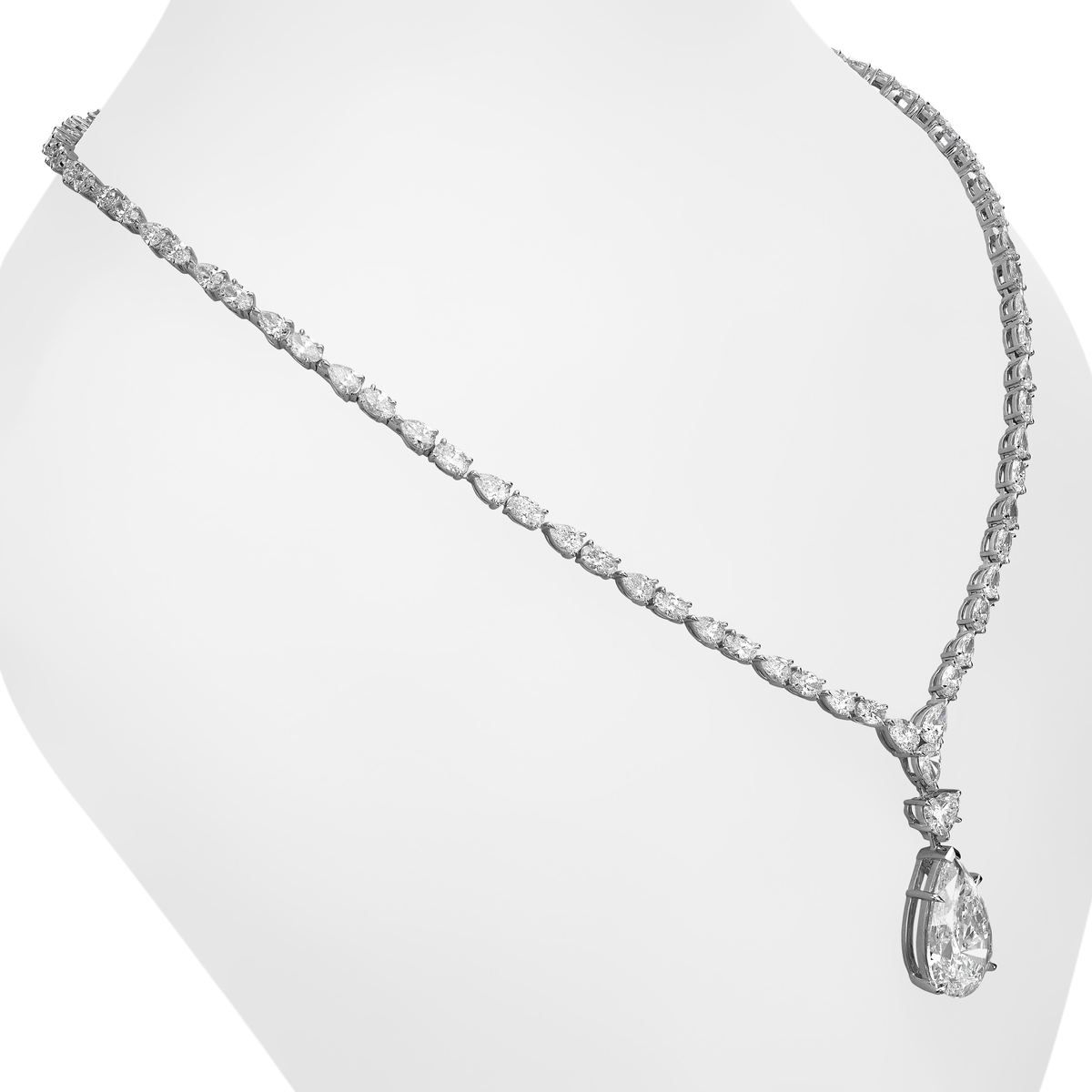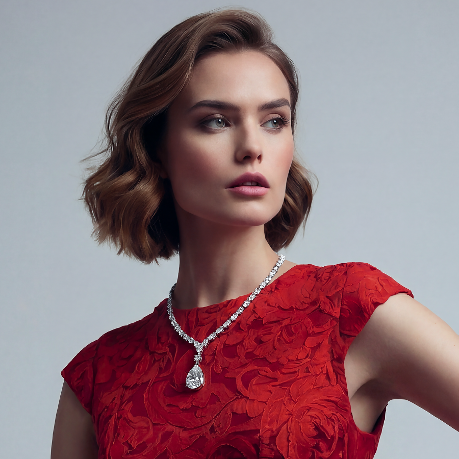 A luminous echo of starlight, cradling a 10.02 ct pear-shaped heart of light. Set in radiant 18K white gold, these 26.08 carats of flawless, F/VVS2 brilliance rest intimately against your skin, a secret symphony of eternal devotion and exquisite grace.