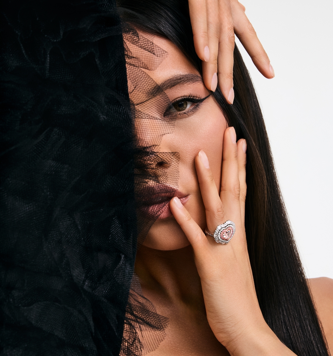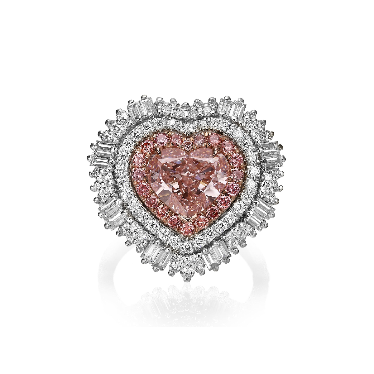 A heart of pure, intense pink light, born of the earth's deep embrace, set in rose and white gold. This magnificent 5.32 carat creation is a whisper of enduring passion, accented by brilliant, flawless baguette diamonds. A jewel of exquisite devotion.