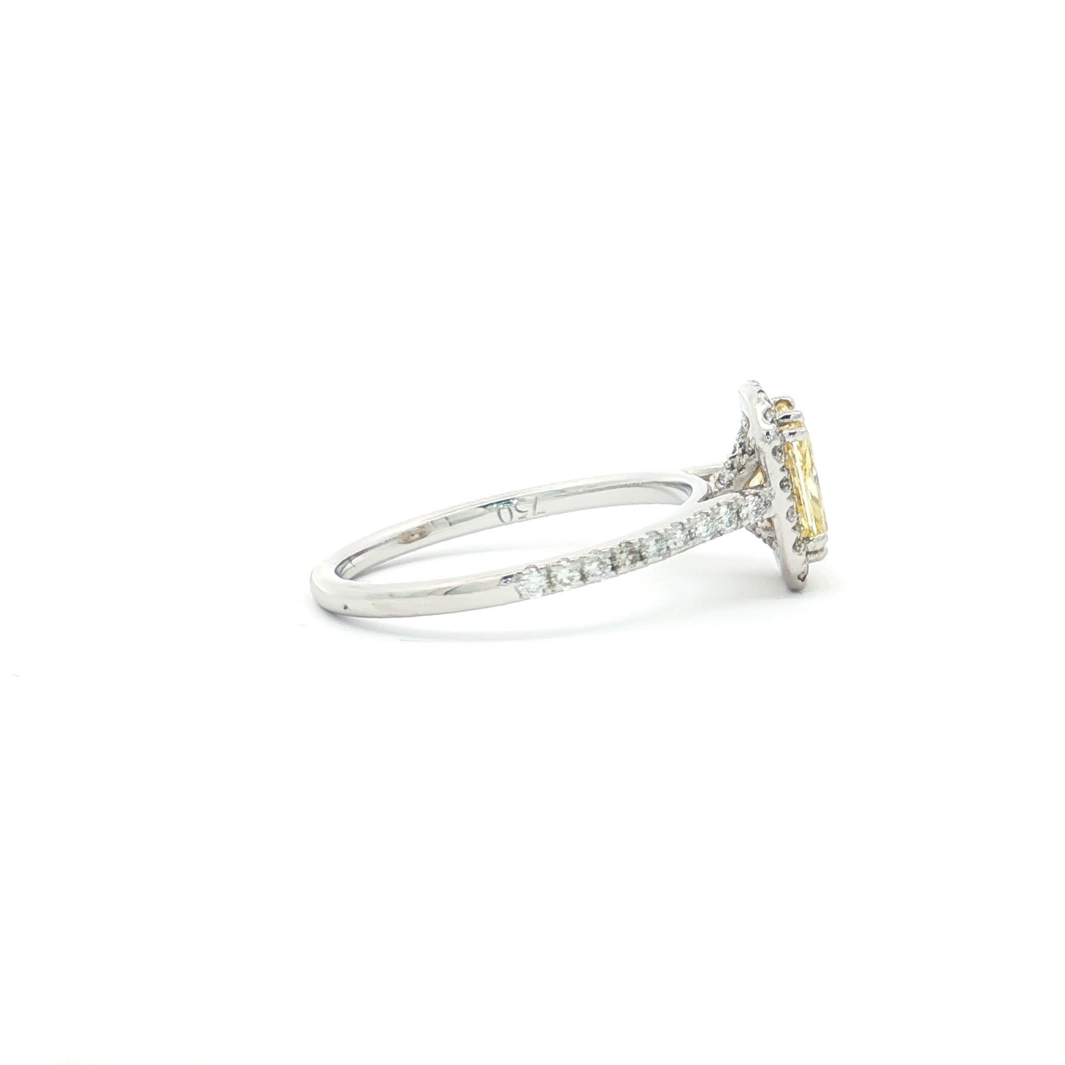 Exquisite ring featuring a fancy vivid yellow diamond. The radiant-cut diamond is set in a halo of smaller diamonds, all mounted on a lustrous white gold band. This ring showcases a harmonious arrangement of fine materials and meticulous craftsmanship, creating a captivating piece of timeless elegance.