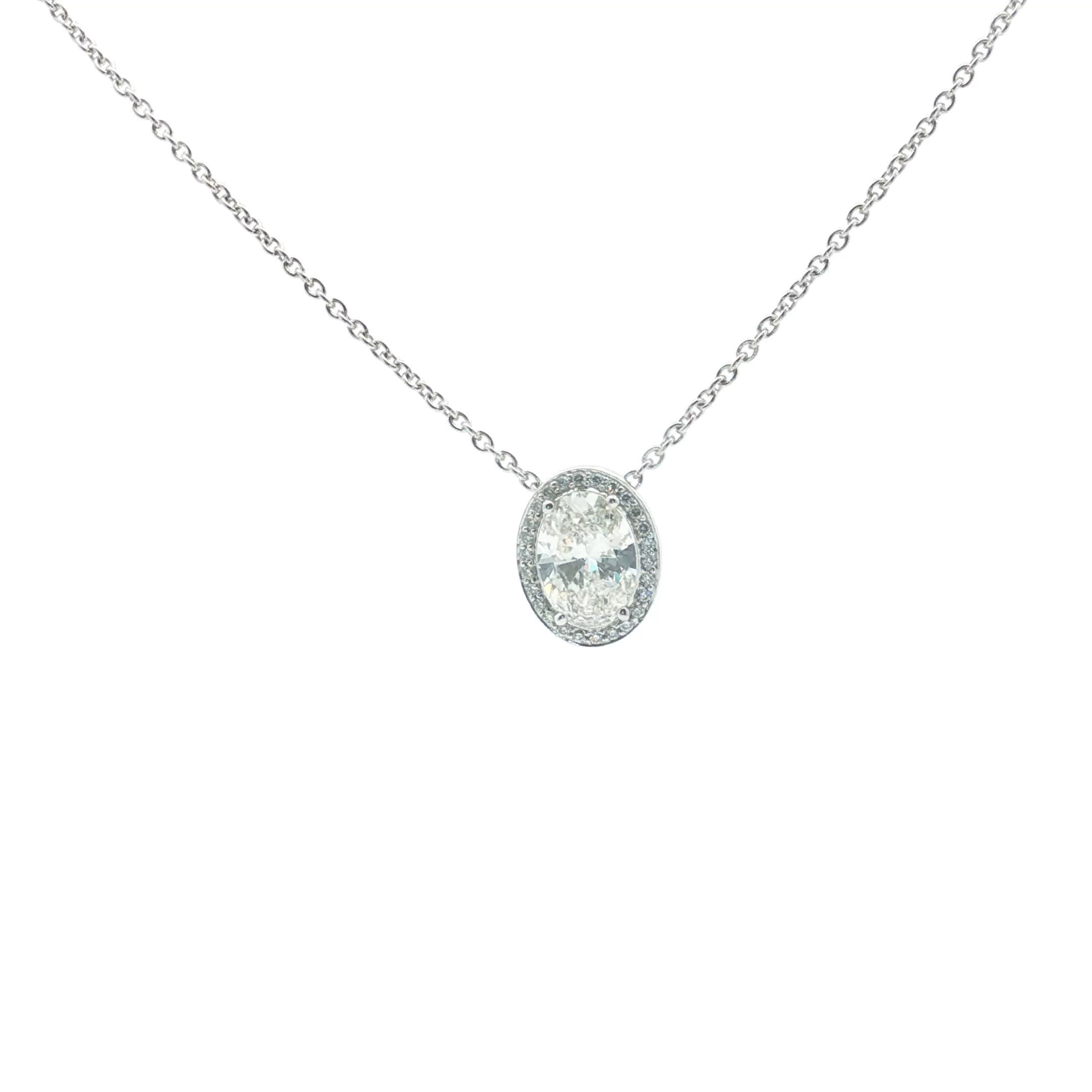 Exquisite diamond necklace featuring a oval cut diamond. The stunning gemstone is set in a white gold pendant. This diamond necklace is suspended vertically, offering an elegant and sophisticated design. A timeless piece that exudes luxury and style.