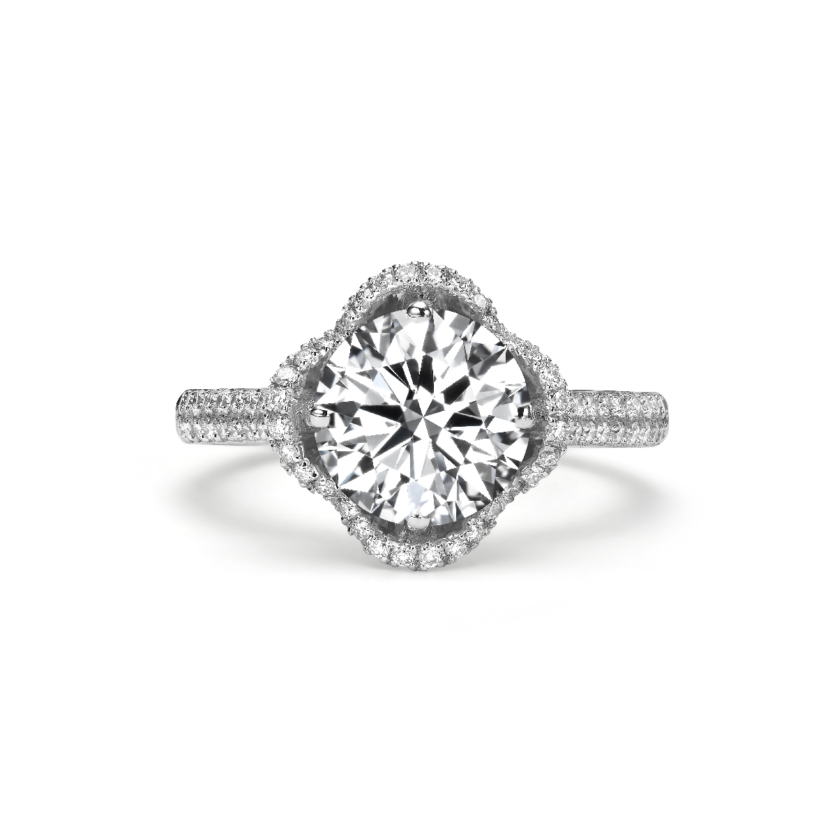 A silent promise of eternal light, cast in 18K white gold. 4.47 carats of luminous, laboratory-grown diamonds—a magnificent 2.00 CT Round Brilliant stone embraced by brilliant accents. A reflection of your deepest brilliance, captured in a singular, exquisite form.