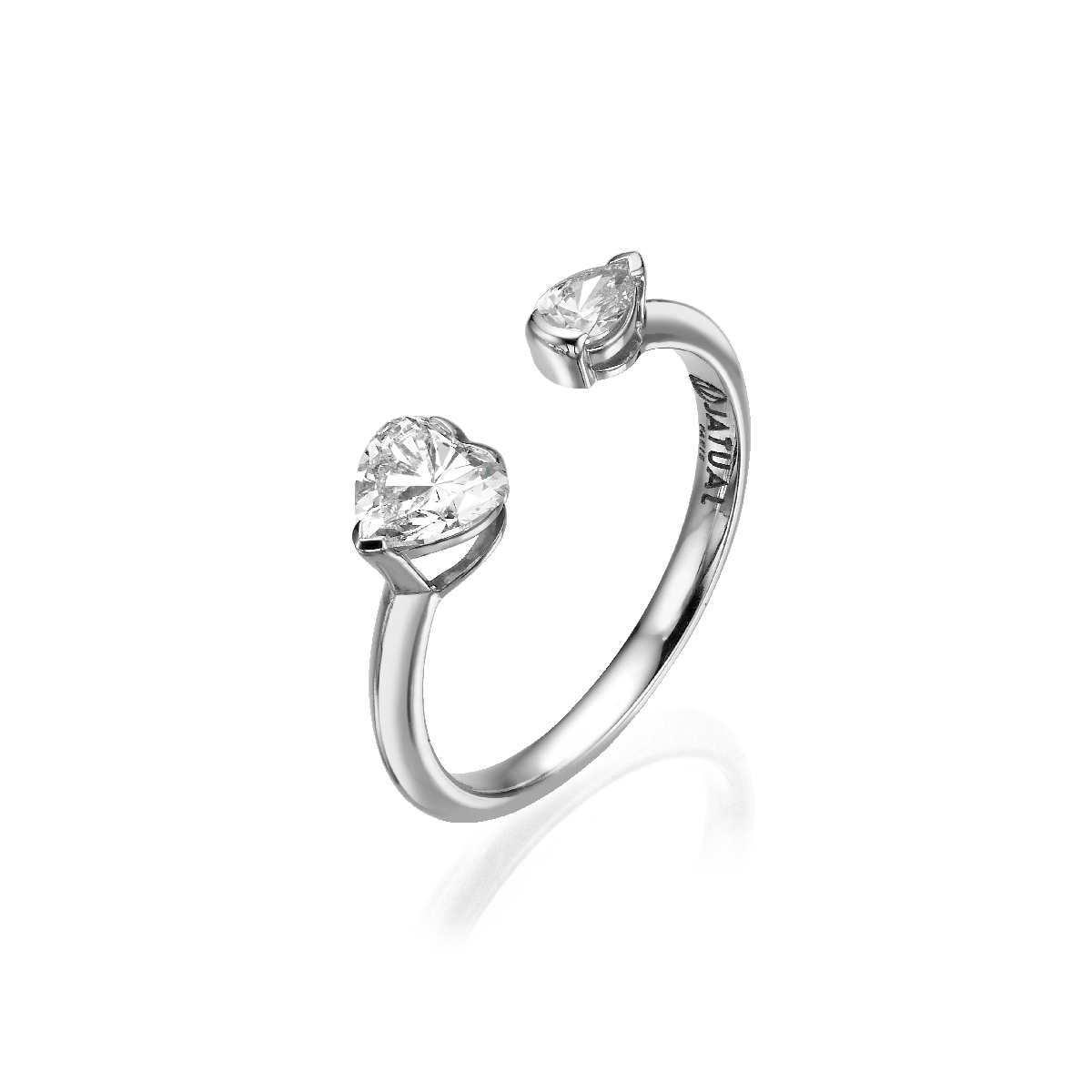 Crafted in luminous 18K white gold, this romantic ring unites a brilliant 0.70ct heart lab grown diamond with a delicate 0.27ct pear lab grown diamond. An elegant dance of pure D-color brilliance, it sparkles with a refined 0.97 total carats.