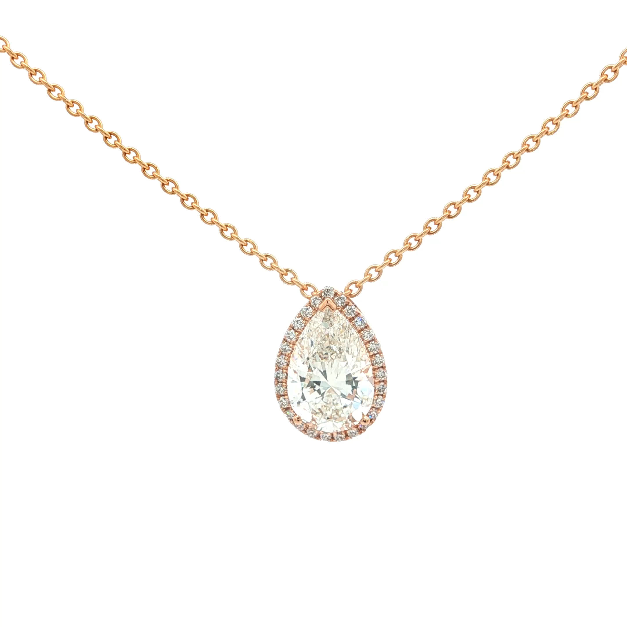 Exquisite rose gold necklace featuring a pear-shaped diamond. The delicate chain complements the captivating sparkle of the diamond, creating a luxurious and refined piece. This necklace is perfect for adding a touch of elegance and sophistication to any ensemble.