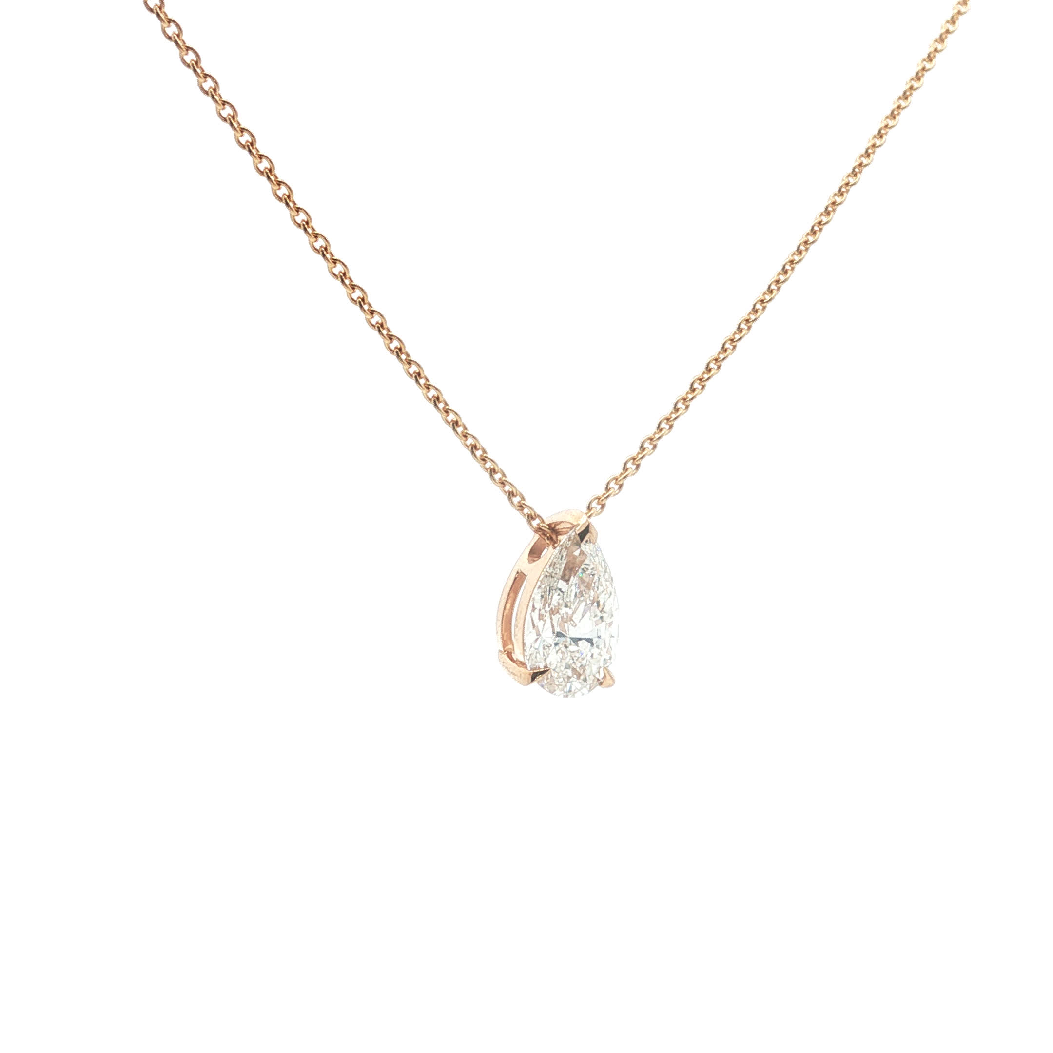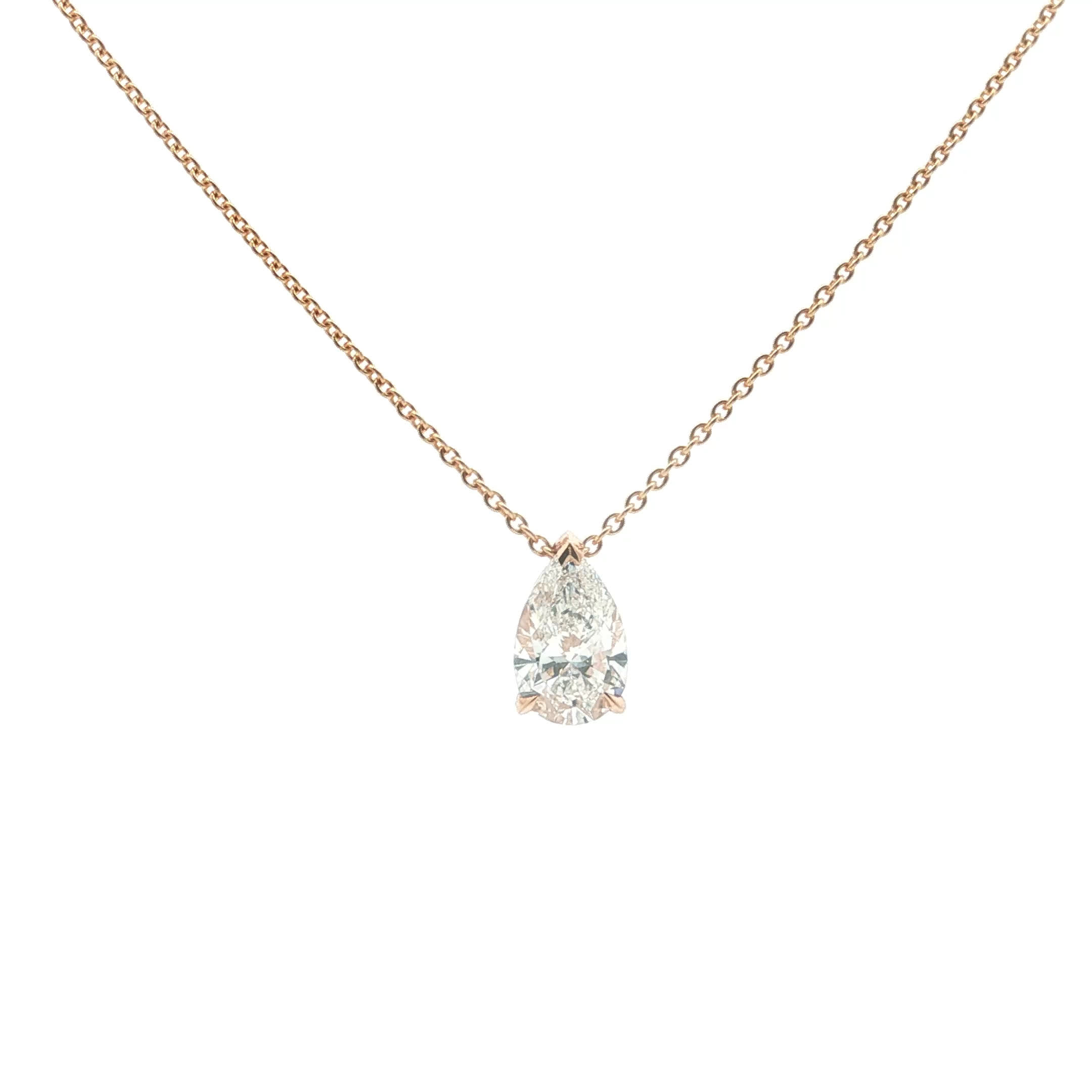 Elevate your style with this exquisite diamond necklace. A pear cut diamond pendant, known for its unique teardrop shape and brilliant cutting style, suspends gracefully from a delicate rose gold chain. The necklace is a timeless piece offering elegance and sophistication.