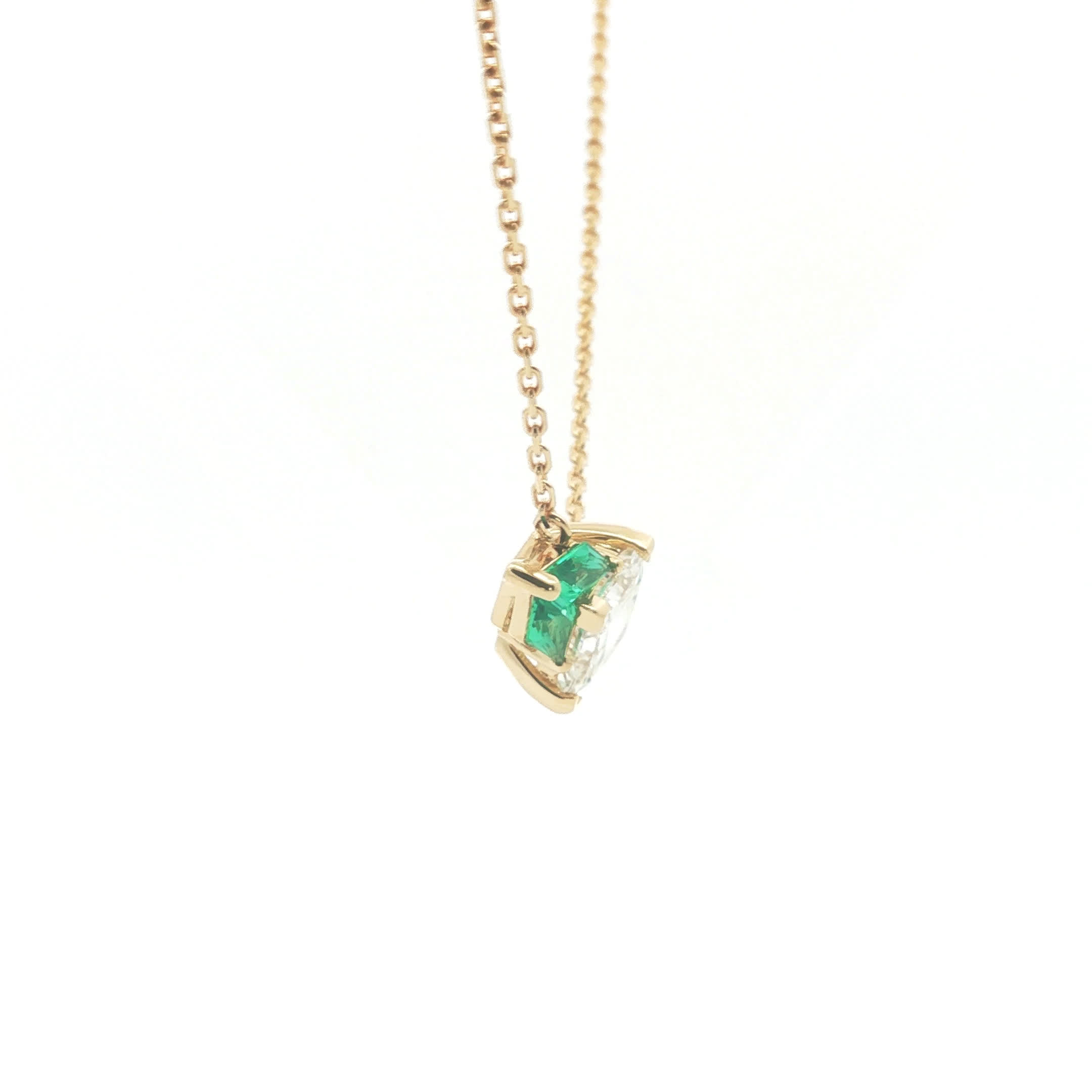 Exquisitely crafted, this yellow gold chain necklace features a captivating princess cut diamond with a brilliant cutting style. Flanking the diamond are vibrant green, step cut emeralds, adding a touch of sophistication and color. The necklace is suspended vertically, showcasing the unique arrangement of precious stones in a harmonious design.