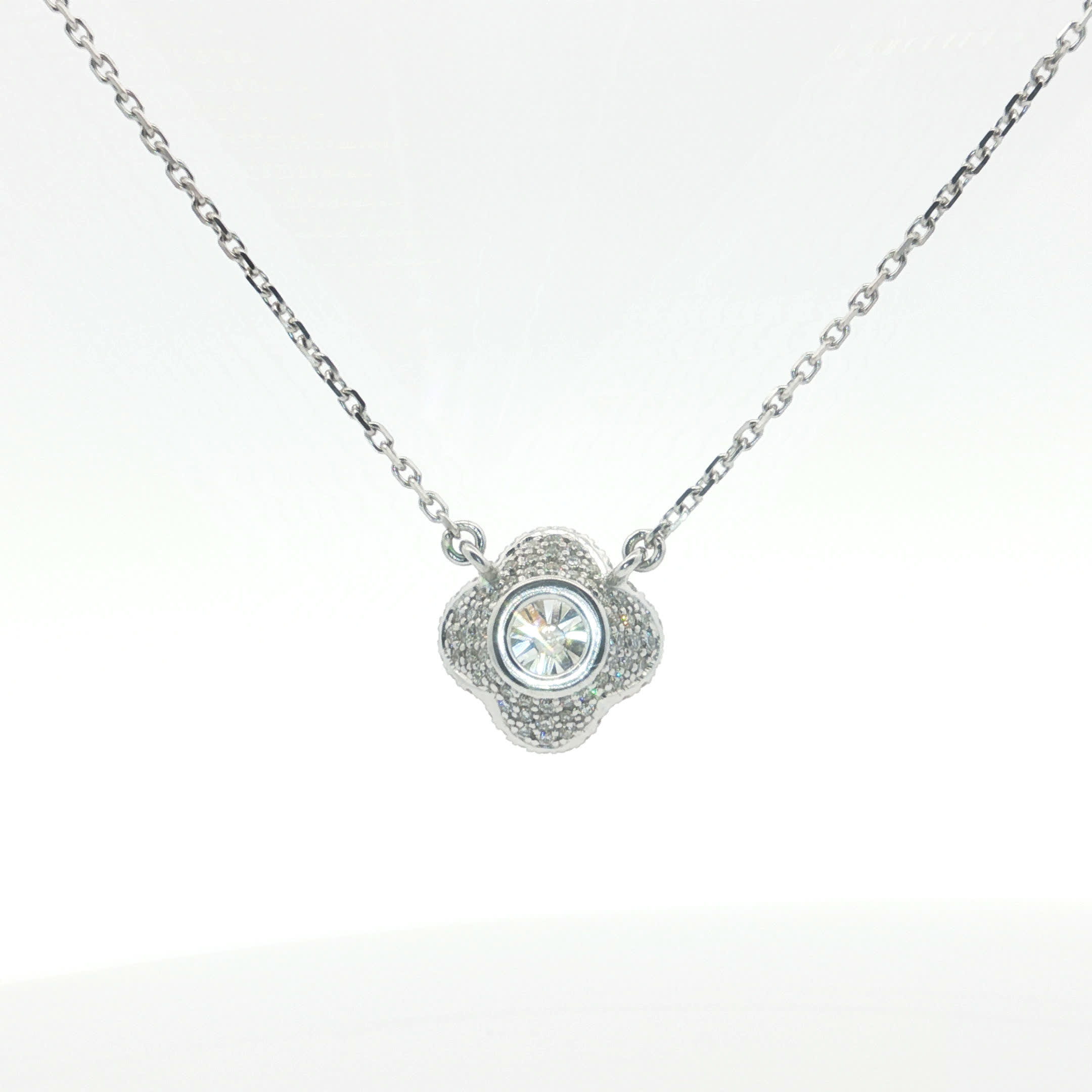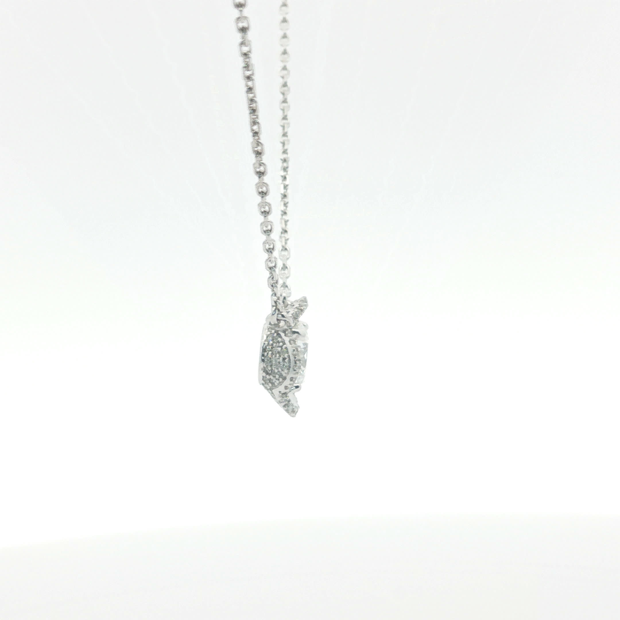 Elevate your elegance with this exquisite diamond pendant. Crafted in shimmering white gold , the pendant features a dazzling round brilliant cut diamond. This exceptional piece showcases superior transparency, polish, and symmetry, making it a perfect addition to your jewelry collection. The necklace has distinctive markings, adding to its unique charm.