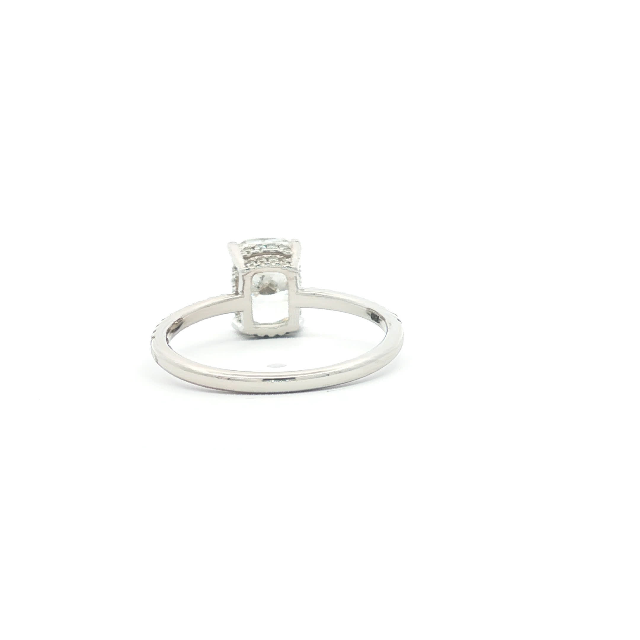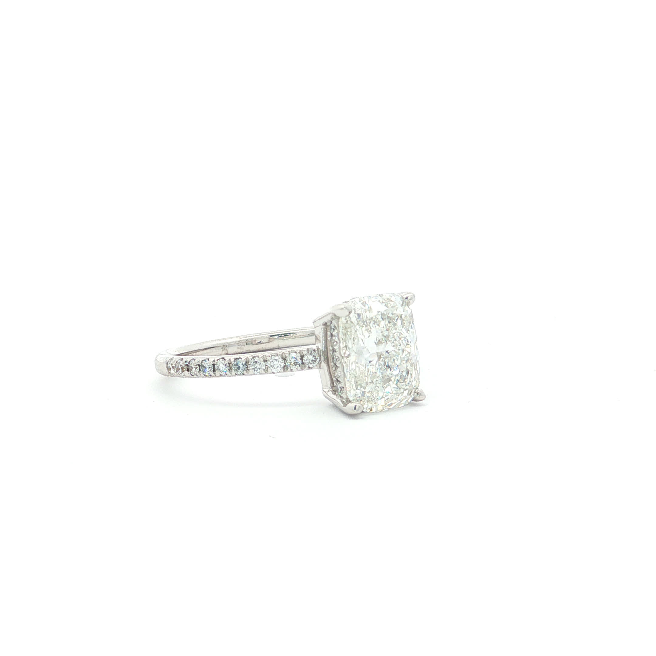 Behold an exquisite diamond ring, its band gracefully crafted from white gold. The centerpiece is a cushion cut diamond, exhibiting a brilliant cutting style that maximizes its radiant sparkle and fire, resulting in a breathtaking symphony of light and sophistication.