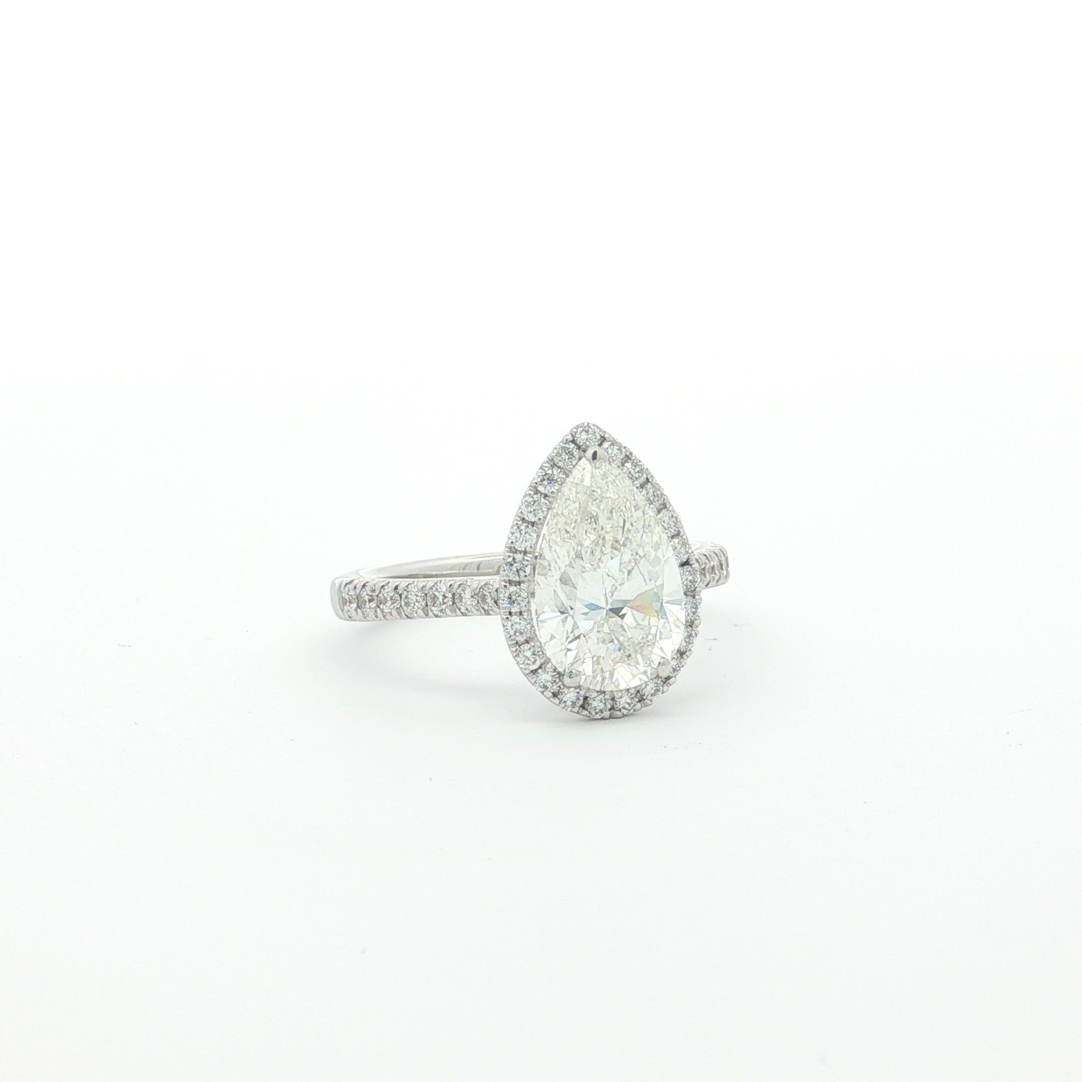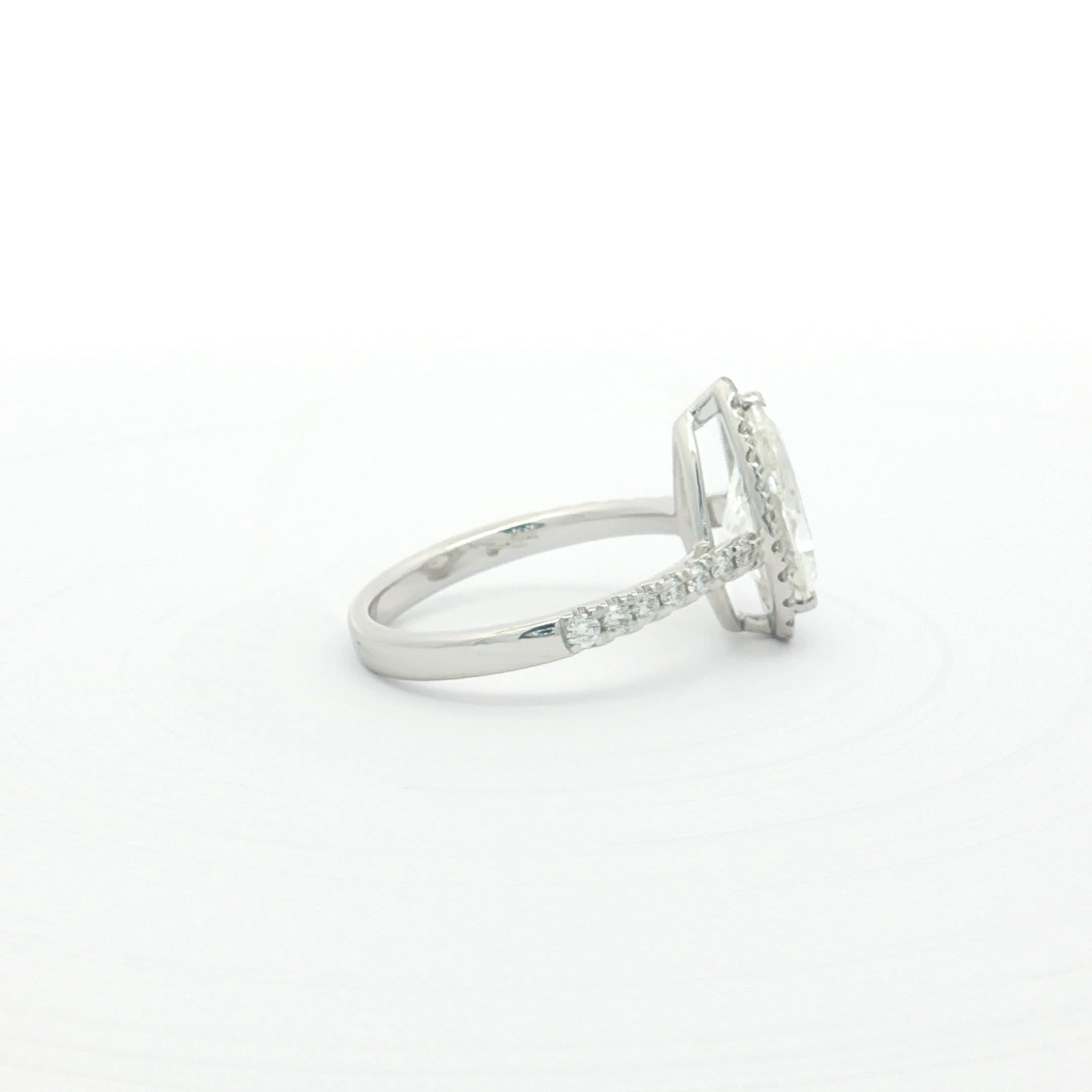 Presenting a mesmerizing engagement ring, expertly crafted in white gold and radiating elegance. This ring showcases a pear shaped diamond, known for its brilliant cutting style, creating a scintillating play of light. A timeless symbol of commitment.